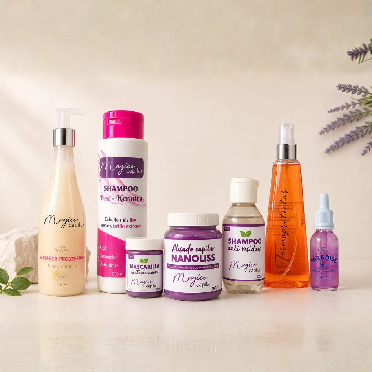 CONTENIDO: Champú post keratina 500ml, termoprotector liquido 250ml , Tratamiento post alisado algodon y miel 250ml . Nanoplastia 180gr , Champu antiresiduos 120ml , Mascarilla hidroreparadora 120ml ,