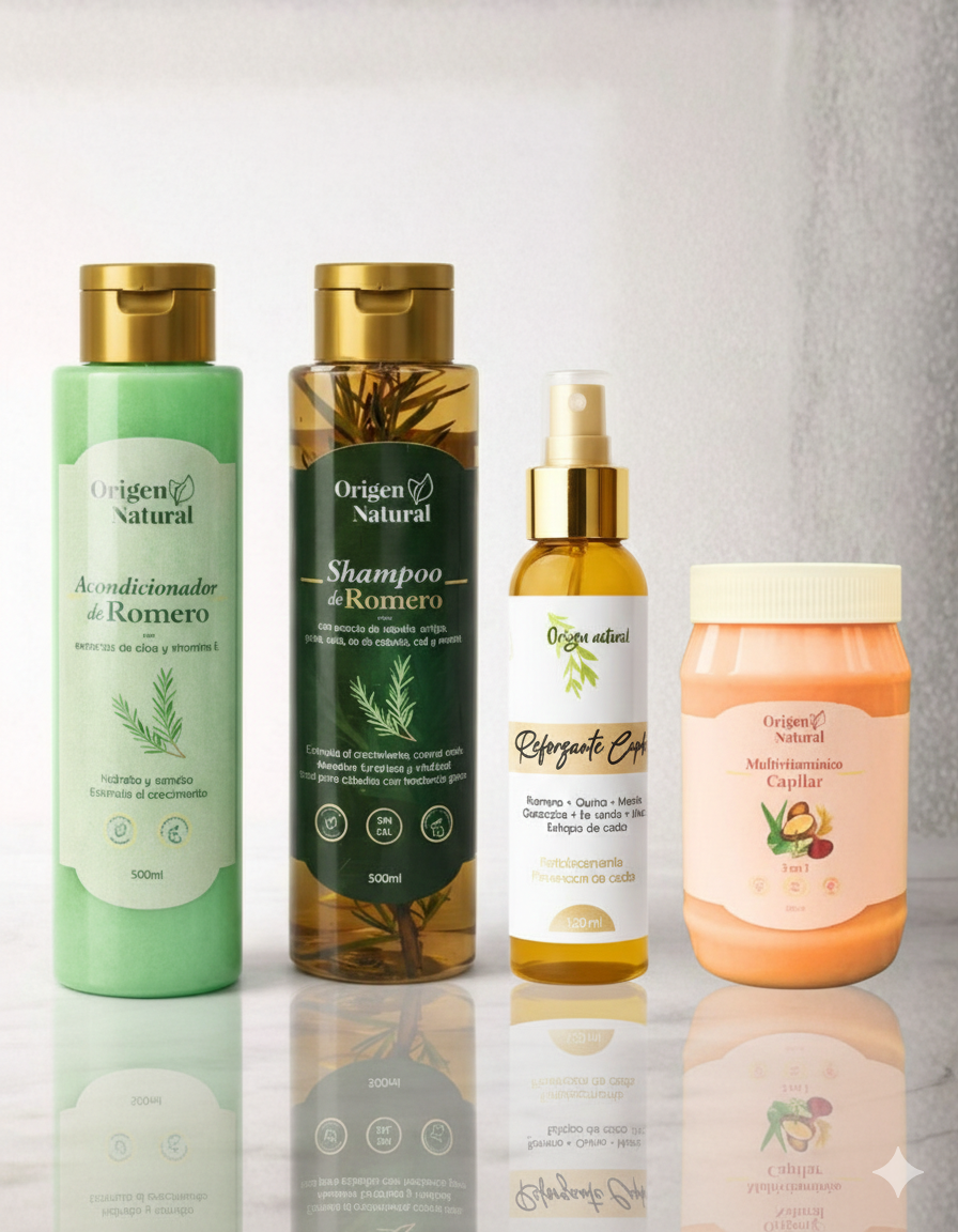 Contenido: Shampoo y acondicionador de romero 500ml , Tonico reforzante capilar 120ml, Multivitaminico 400ml